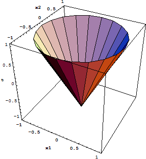 where A ∈ RkXn, a second-order cone constraint of dimension k+1 because it is the same as requiring the affine function x→(Ax+b,cTx+d) from Rn to Rk+1 to lie in the second order cone in Rk+1. The second-order cone is also known by several other names: it is called the quadratic cone since it is defined by a quadratic inequality, or it is also called the Lorentz cone or ice-cream cone. The following image shows a second-order cone in R3: